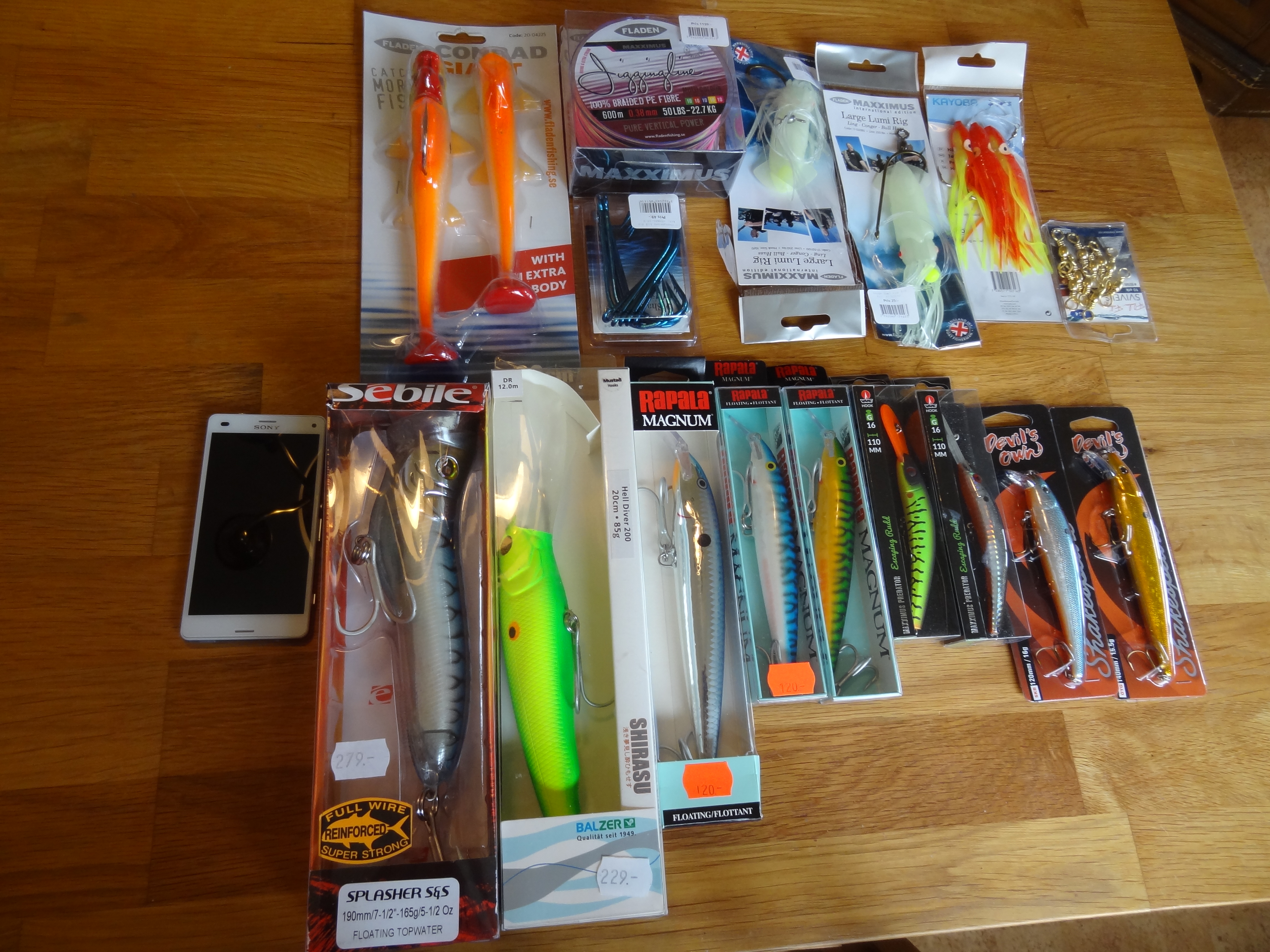 För detta måste vi ju ha lite bra drag och här är några, lade telefonen vid sidan för att ni skall förstå storleken. Vissa går några meter under ytan och vissa går på ytan. Guldmakrillen gillar flygfisk. Rapala-drag på rekommendation av Lasse Wennergren och Lisbet Ekman efter deras 9 års erfarenhet på haven runt jorden. Ni kan läsa deras resebrev på www.hilda.nu