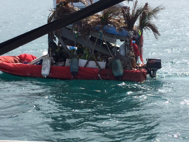 Den här skruttiga båten kör omkring i Rodney Bay och försöker sälja frukt mm. Han har varit i slagsmål med Hans Warberg när Hans filmade honom! Som tur var hade han glömt detta !