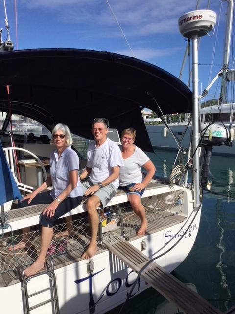 Britt , Bosse och Lena + skepparn som tar kortet är den nya besättningen på Toga. Lite bleka i skinnet nu men fin solbränna ska det bli efter 3 veckor !
