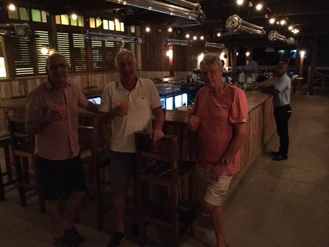 Här ser ni tre nöjda seglare på Basils Bar på Musticue ( kändisön ) ! Vi seglade idag från Bequia till Musticue i god vind med några kryss ! Kvällen avrundas efter en barbecue på lokal restaurang med en rumpunch .