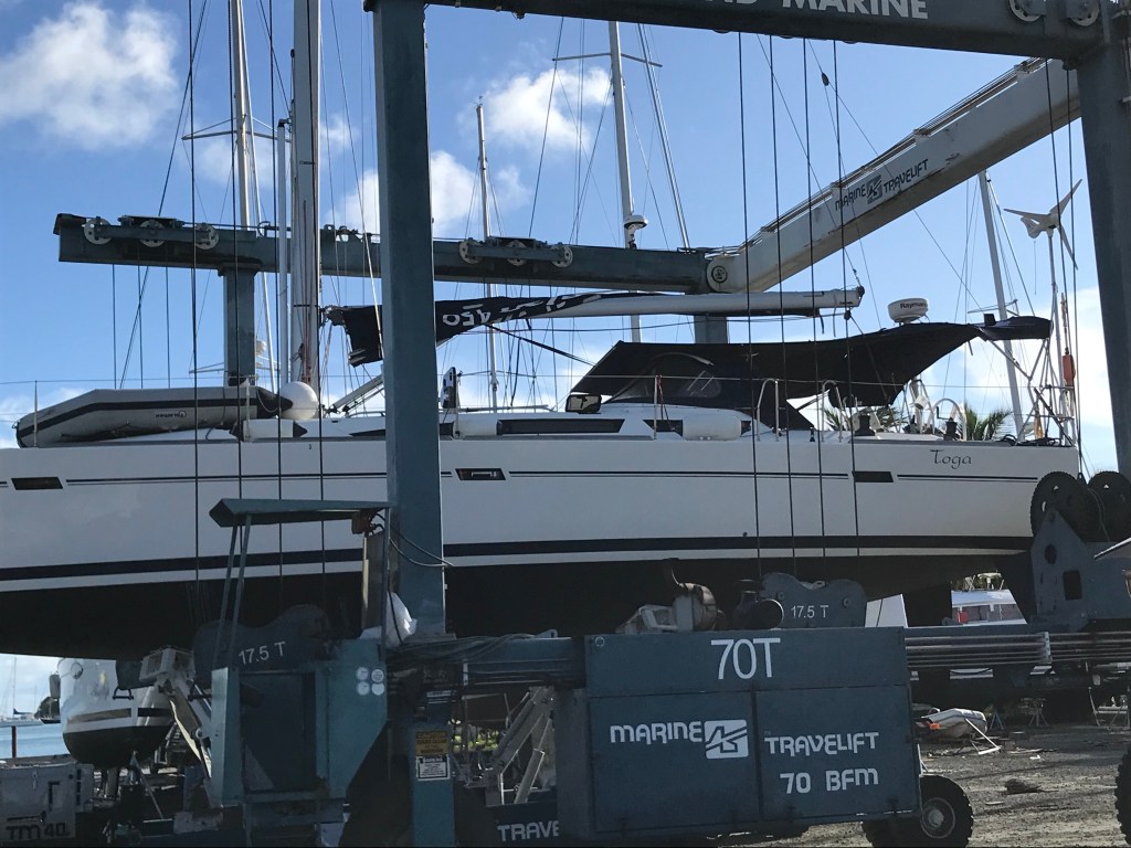 Vad skönt det ska bli att rulla in o ut genuan med en knapptryckning ! Speciellt när Lena o jag seglar själva .Här håller mekanikerna på att installera elfurlexen . Tro det eller ej men det är en kille nere i ankarboxen ! Det var smala o viga killar som tur var !Äntligen sjösättning ! Hon är välpolerad i fin !Motorn startade så fint o tryggt . Vi styrde ut i Prickly Bay och det första vi gjorde efter att vi ankrat var att ta ett dopp i det underbara vattnet! Därpå följer en ankerdramm ( drink) !På tal om drink så vad tycks om det nya drinkborden ? Här kan ölen stå säker i alla väder !