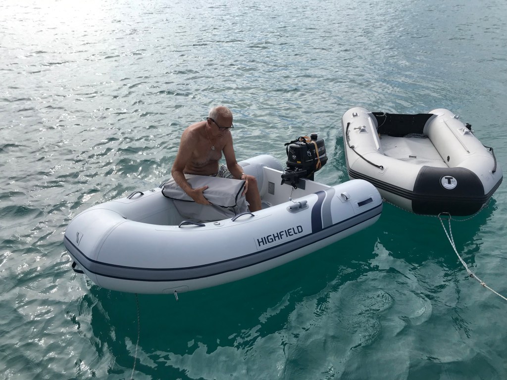 Vi var så trötta på den gamla jollen som gjorde oss dyngblöta . Dessutom var den ranglig och långsam ! Den nya planar med 2 personer om det ska behövas . Med en person går den som tusan . Den gamla ska vi försöka sälja på vägen .