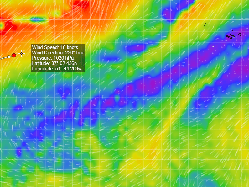 På 9 dygn har vi seglat 1387 distans och prognosen säger att vi ska nå Horta på Azorerna om ca 7 dagar. Vi har inga fiskelinor ute idag då vi går för snabbt för att fånga något och att linan troligtvis går av direkt det nappar. Alla mår fint även om det är jobbigt att sova och laga mat när vi går så fort i höga vågor.