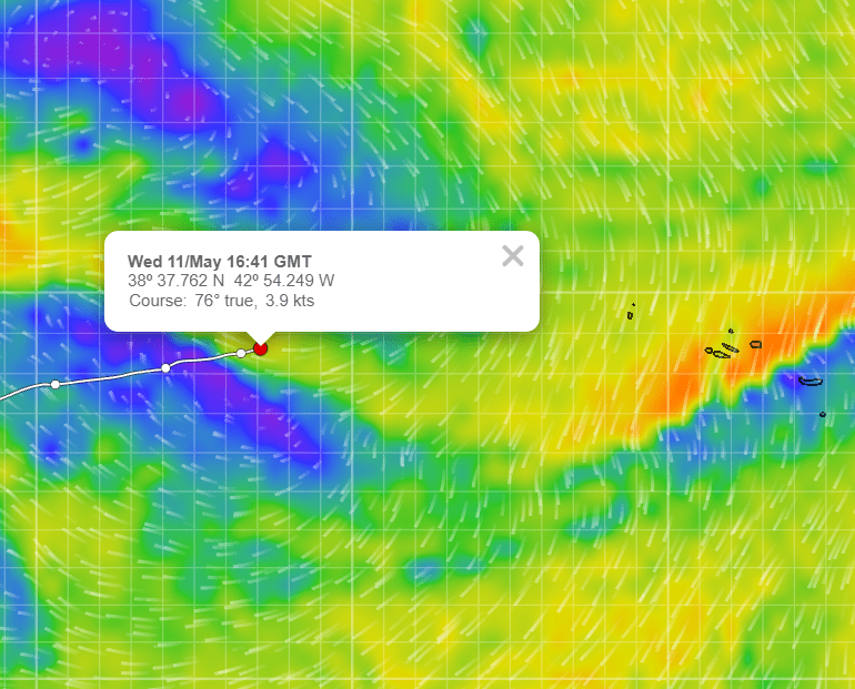 Dygn 12 gjorde vi 142 distans under enbart motorgång. Havet låg blankt hela dagen igår och imorse fick vi en svag vind rakt från Azorerna. Blir jobbigt att sova och frustrerande att gå enbart för motor. Blir lätt att man fastnar i ett högtryck mellan Bermuda och Azorerna då lågtrycken rör sig fortare än vi kan segla. Nu ser det ut som nästan 2 dygn till med motor innan nästa lågtryck hinner ikapp oss för att trycka oss hela vägen till Azorerna.