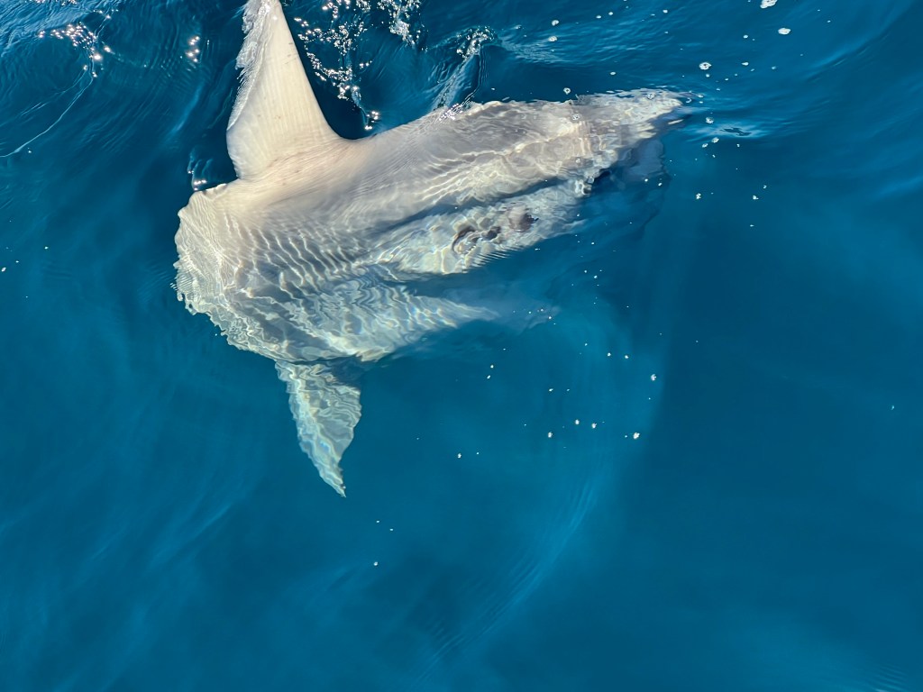 Vi såg några måsar som var nyfikna på något som rörde sig i vattnet och styrde dit . Vi såg först en stor fena som rörde sig och en stor fisk ca 1,5 meter ,som inte liknade något vi sett förut ? Rumphuggen om man säger så ! Är det någon som vet vilken fisk det kan vara ?
