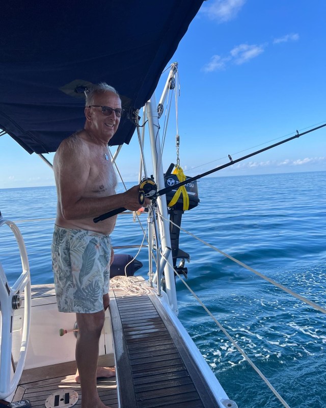Äntligen napp och det visade sig vara en liten guldmakrill ! Den var enkel att rensa för den skulle stekas hel . På kvällen tillagades fisken med hollandaisesås och kokt potatis. Till detta serverades ett väl kylt vitt vin. Fantastiskt gott !