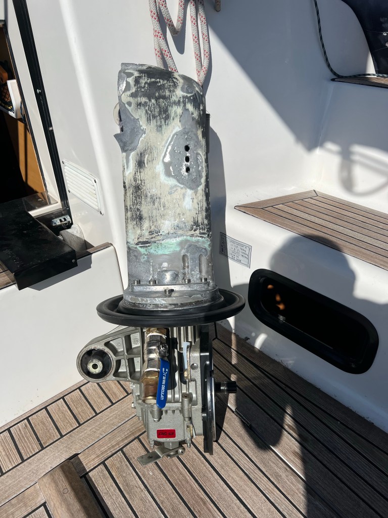 Det var dags att byta gummitätningen till segeldrevet som blev mer omfattande än vad vi hade räknat med ! Mekanikern som inte var av den lilla storleken hade ett styvtjobb . Dessutom sprack bakstycket när han skulle dra ur drivaxeln så då gick det ytterligare några dagar för reservdelar att komma fram. Avgasröken som skulle bytas var helt genomrostig. Dieselturbon gick heller inte att rädda så det blir en ny !